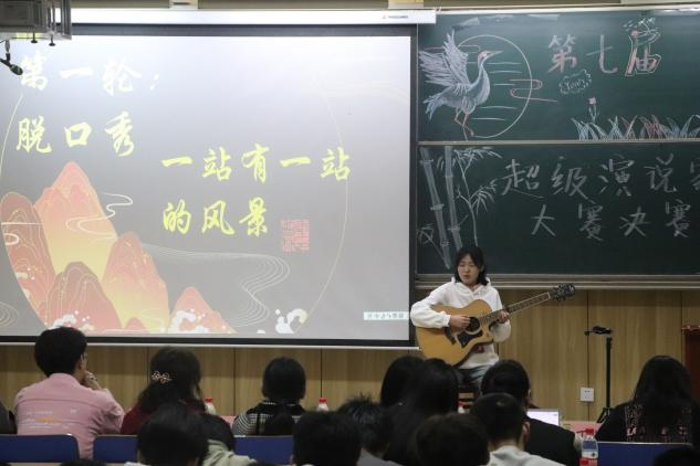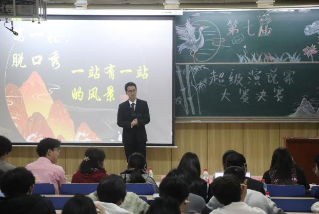 本次决赛共分为两轮。第一轮是主题为“一站有一站的风景”的限时三分钟的脱口秀表演,第二轮是参赛选手根据给出的视频或图片在准备两分钟后进行三分钟的即兴演讲。决赛共计七位选手参加,每位选手按照抽签顺序上台演讲。此次比赛以抽签形式决定出场顺序。在欣赏了于保瑞同学带了精彩的开场表演《改变自己》后,精彩的比赛彻底拉开序幕。选手们精神抖擞,神采奕奕,上台时胸有成竹,用最生动的语言来展现对人生中站站风景的解读。