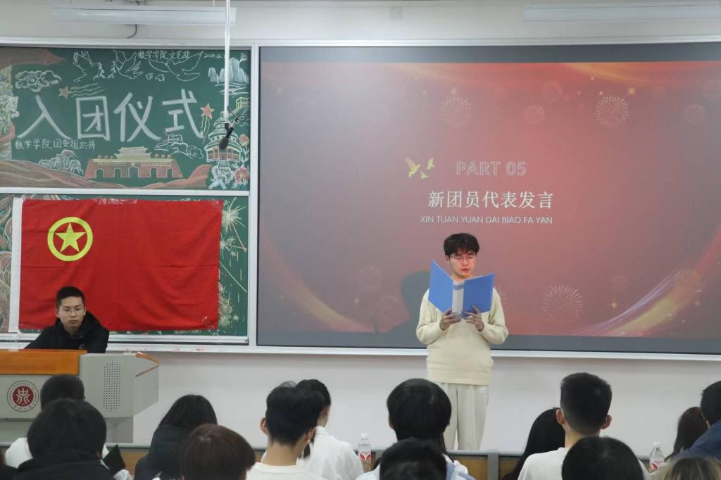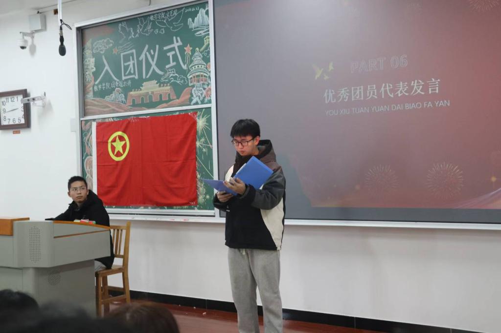 活动第五项,新团员代表张翔元同学发言,他表示加入共青团不仅是一份荣誉,更是一份责任。在今后的学习和生活中,将以团员的标准严格要求自己,努力学习科学文化知识,不断提升自身素养,在同学中发挥模范带头作用,带领大家共同进步。