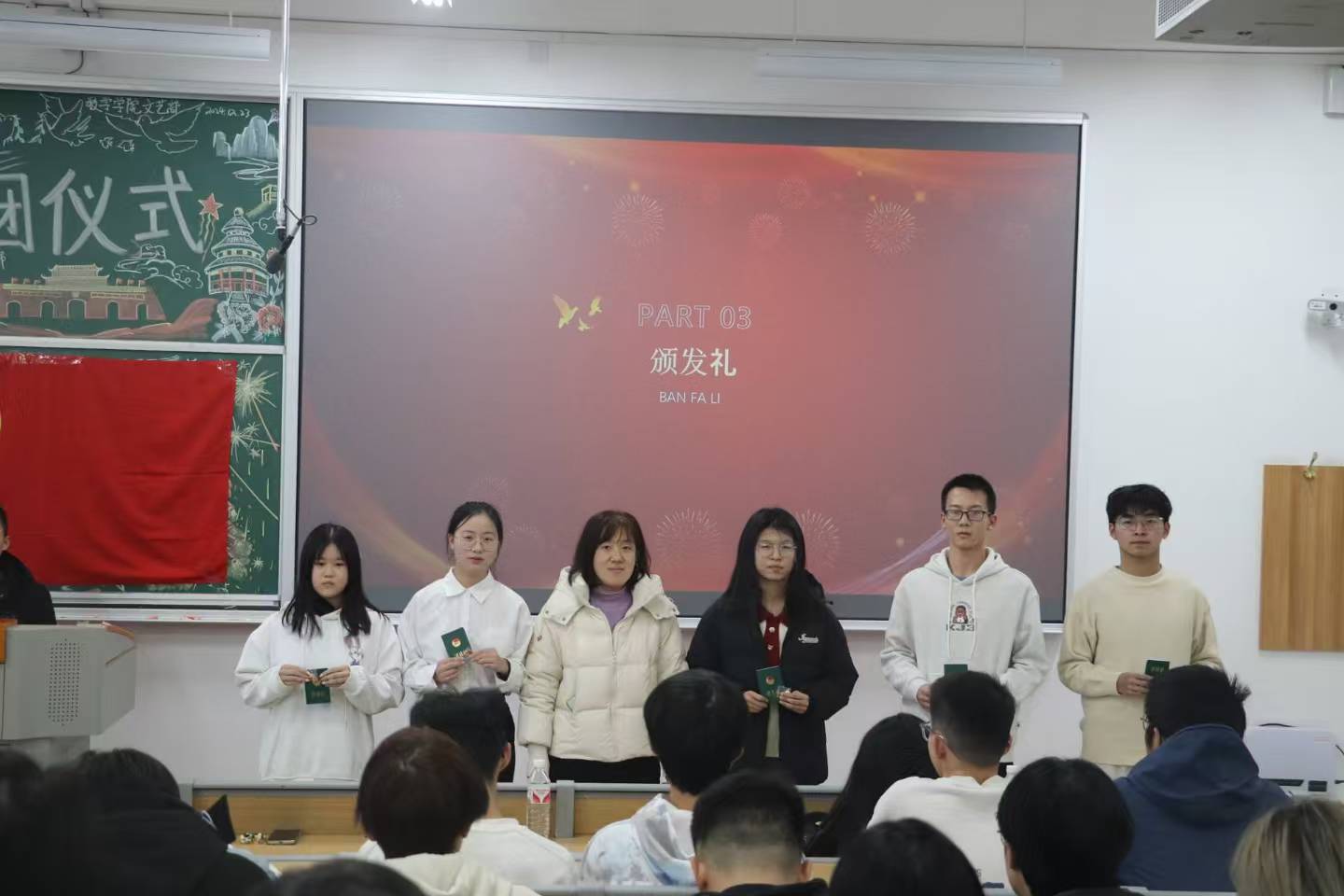 活动第二项,主持人宣读了新团员名单,此次共有 50 名优秀学生经过层层考验,光荣地加入了中国共产主义青年团。他们在学业上勤奋刻苦,在品德修养上追求卓越,在社会实践中积极奉献,充分展现了新时代青年学子的良好风貌。在热烈的掌声中,新团员代表们依次走上台,学生科于敏老师为他们颁发团员证和团徽。团徽熠熠生辉。这小小的团徽,不仅象征着一份沉甸甸的责任与使命,它将时刻提醒着新团员们,要以更高的标准要求自己,在思想和行动上都成为同学们的楷模。