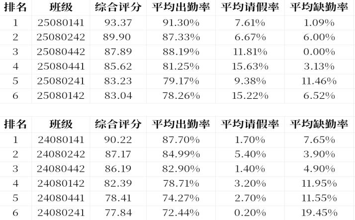 以平均出勤率为核心,结合缺勤率和请假率进行量化考评,最终分别评选出24、25级本阶段的“学风先进班集体”!