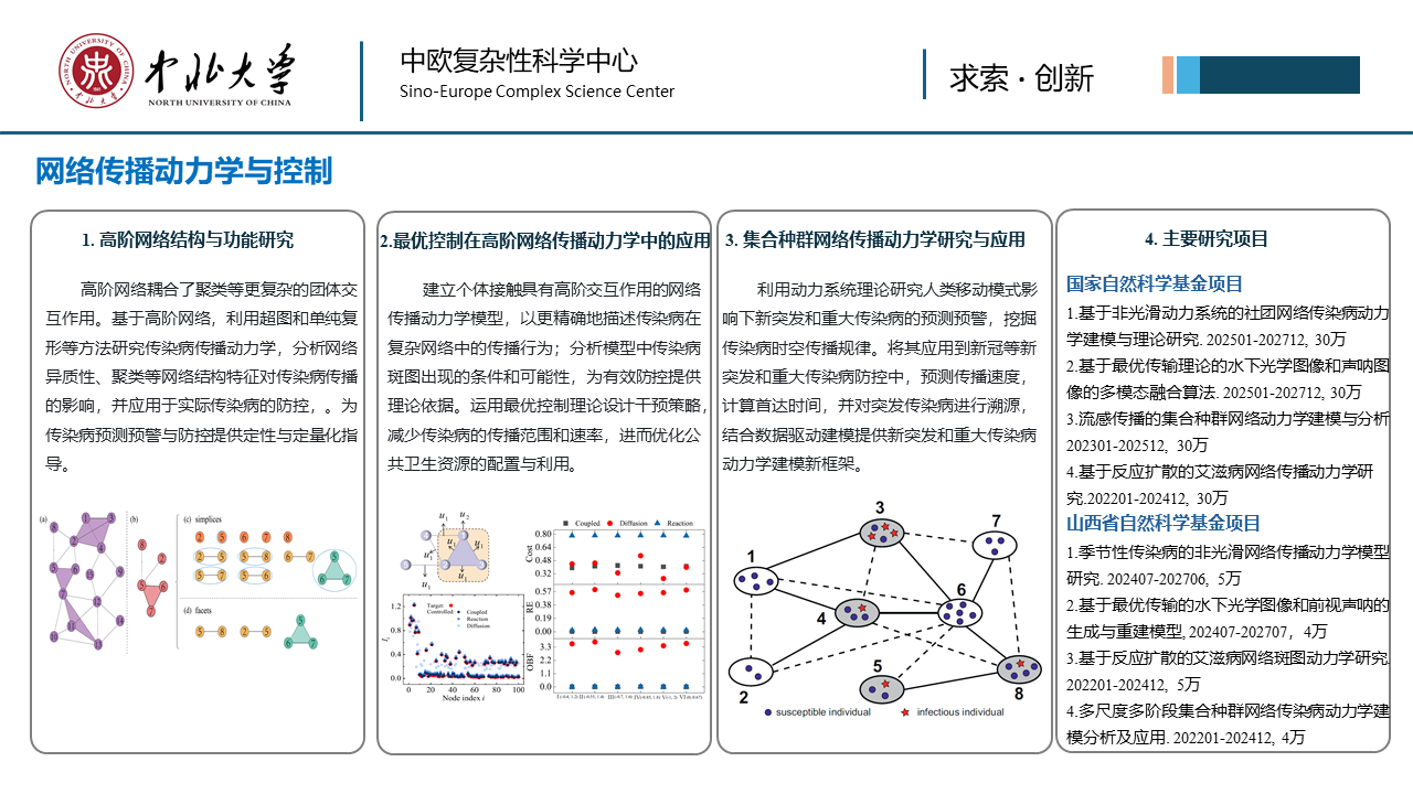 The Sino-European Complexity Science Center at North University of China, established in 2022, conducts fundamental and applied research focusing on the transmission and control for disease, spreading dynamics on networks, as well as ecological environment and atmospheric science. Currently, this center comprises 22 full-time faculty members, including the academician of the european academy of sciences, the national high-level talents, the recipient of special government allowances of the state council, and ESI highly cited researcher.
